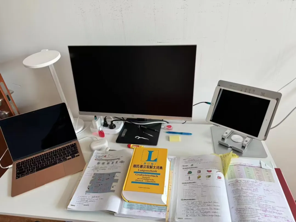 Mit diesen hellen Hintergründen studierte er jeden Tag für 16 bis 18 Stunden Deutsch. Jede Nacht gehe ich um 8 Uhr ins Bett und bin immer noch aktiv.