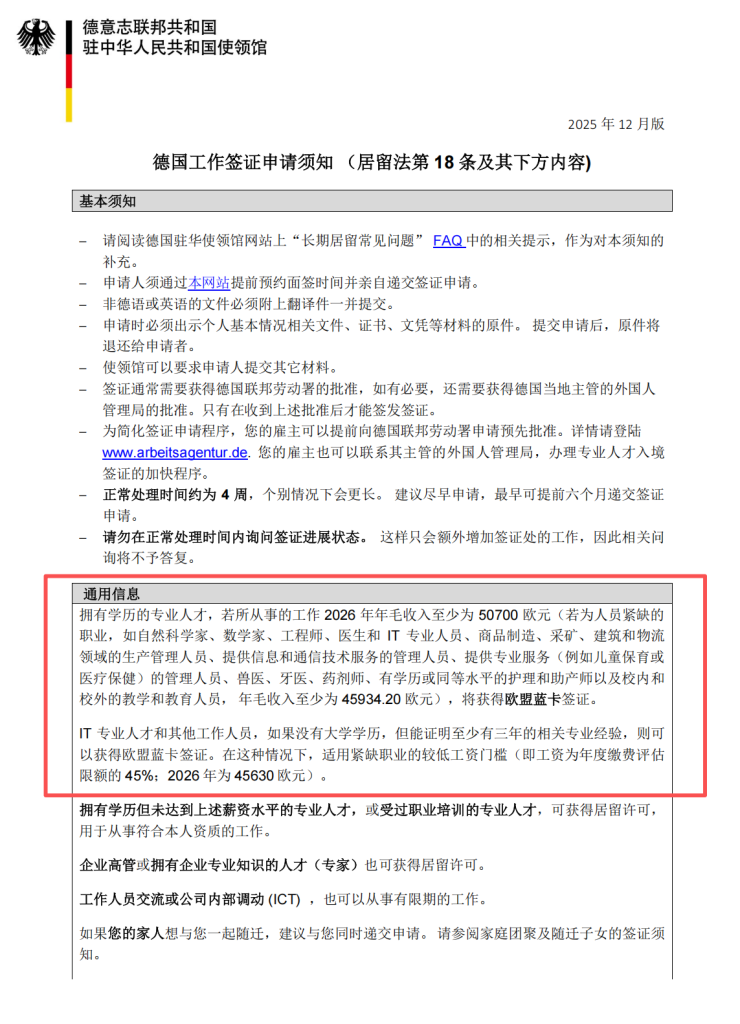 - 紧缺职业及职场新人:适用于自然科学、数学、工程、信息技术(IT)、医生等领域,门槛为税前年收入 45,934.20 欧元(约月薪 3,827.85 欧元)。