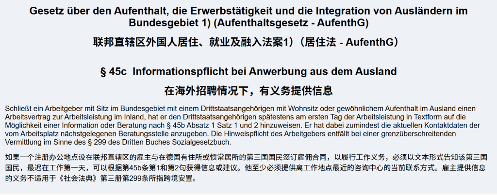 自 2026 年 1 月 1 日起,依据《居留法》第 45b 和 45c 条,2026 德国雇主外籍员工告知义务正式生效。招聘第三国公民的雇主,需在新员工首日工作前,以书面形式(如合同附件、单独通知信)告知其享有德国 “公平融入”(Faire Integration)网络提供的免费劳动法与社会法咨询服务。