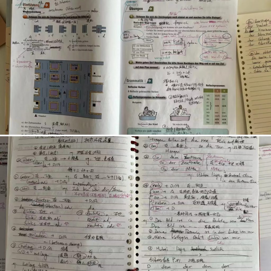 时间堆出来的熟练度:每天学到凌晨 3 点,早上 6 点爬起来去歌德学院线下课,同时上安拙的线上一对一德语辅导。整整 4 个月,雷打不动在群里发学习笔记,哪怕是凌晨 1 点 —— 坚持到最后的只有我一个人。