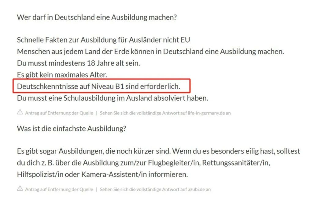 非欧盟申请人的双元制培训,需通过联邦就业局(BA)许可。BA 会审查培训企业合规性,更会重点核查申请人的德语能力 —— 其内部指引明确建议:“专业职业培训(双元制)至少须达到 B1 水平,否则通常至少为 A2(非专业培训可放宽)”,且近年不断强化这一硬标准。