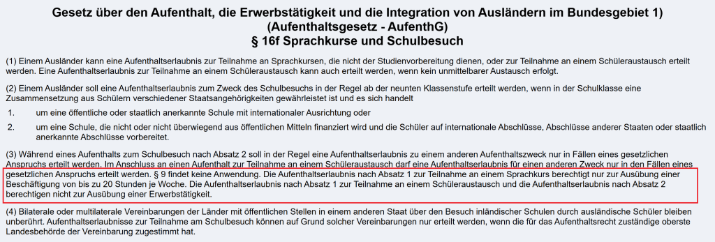 根据《德国居留法》第16f条第 (3) 款规定,德国16F语言签工作权限(每周20小时) 为法律允许——持有者可从事每周不超过20小时的简单工作,但学生交换或中学就读类居留许可无此权限。