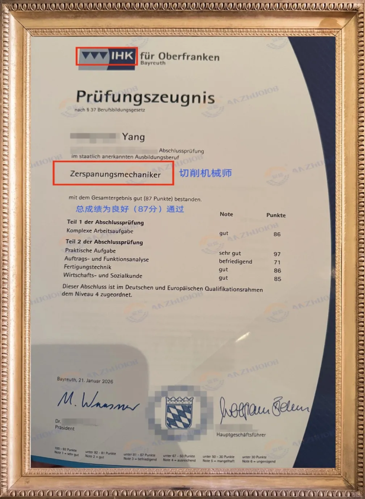 2026年4月,他拿到IHK双元制毕业证书,这份证书,是对他3.5年深耕细作的最好肯定,也标志着他从一名懵懂学子,正式成长为一名具备扎实技能与严谨素养的专业机械从业者。